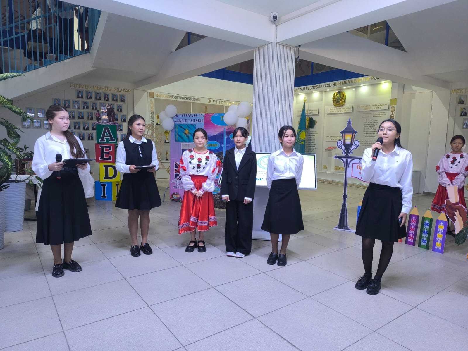 Жүргізушілер аталған апталықтың жоспарымен таныстырып, оқушыларды тілдер мерекесіне арналған апталыққа белсенді қатысуға шақырды. Мақсаты- оқушылардың өз ана тіліне деген құрмет сезімін арттыру, тіл мәртебесін көтеру, таза сөйлеуге үйрету, өз ұлтына, еліне деген сүйіспеншілігін ояту.